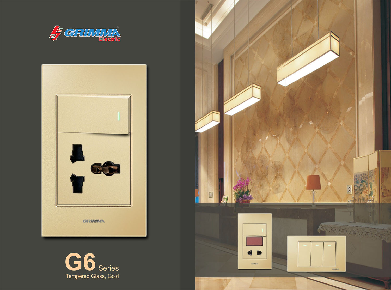 Bộ công tắc đơn 1 chiều và ổ cắm 2 chấu Grimma, mặt kính cường lực G6 series G6GLGK12SK2
