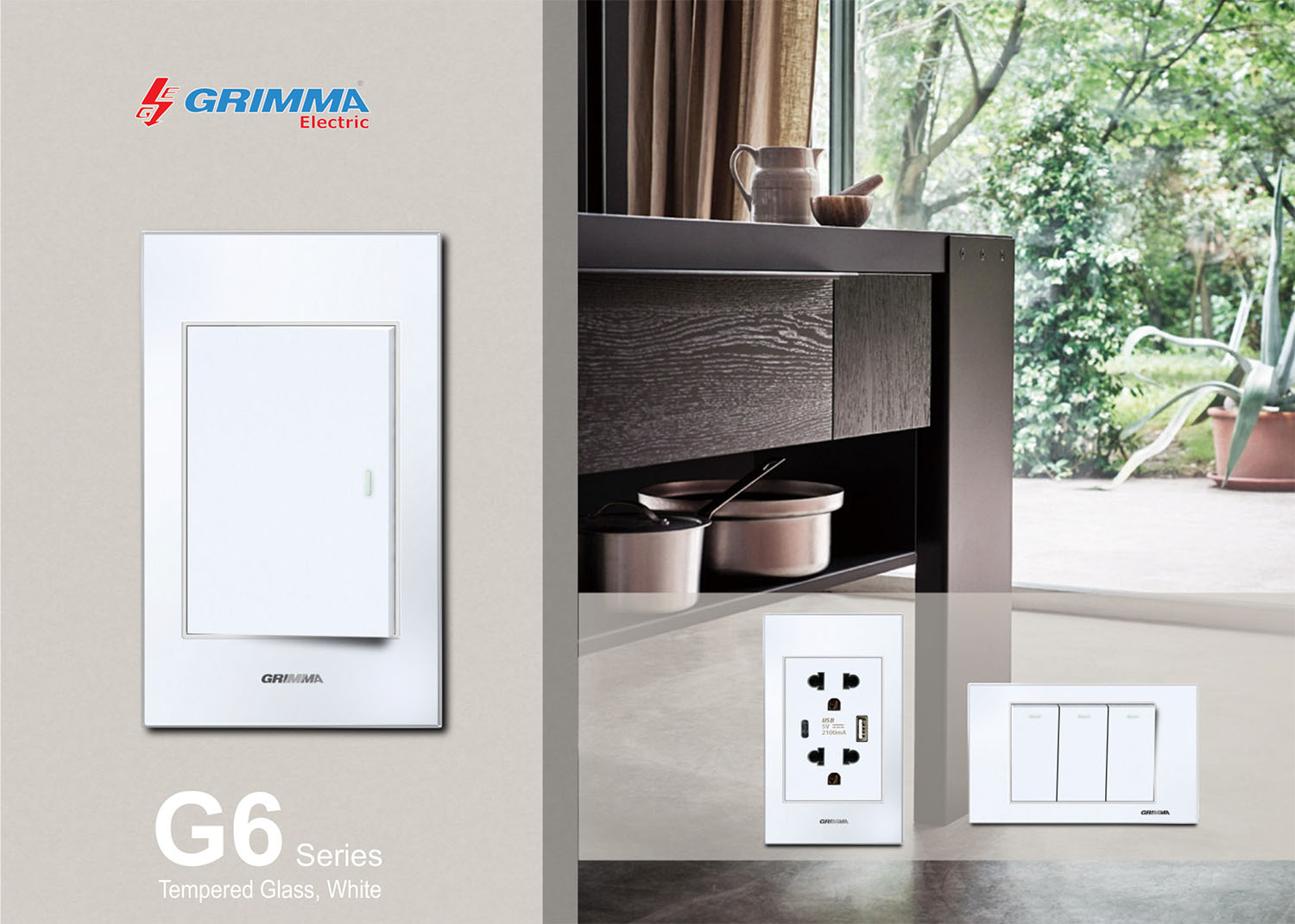 Bộ công tắc đơn 2 chiều và ổ cắm 2 chấu Grimma, mặt kính cường lực G6 series G6GLWK12SK2