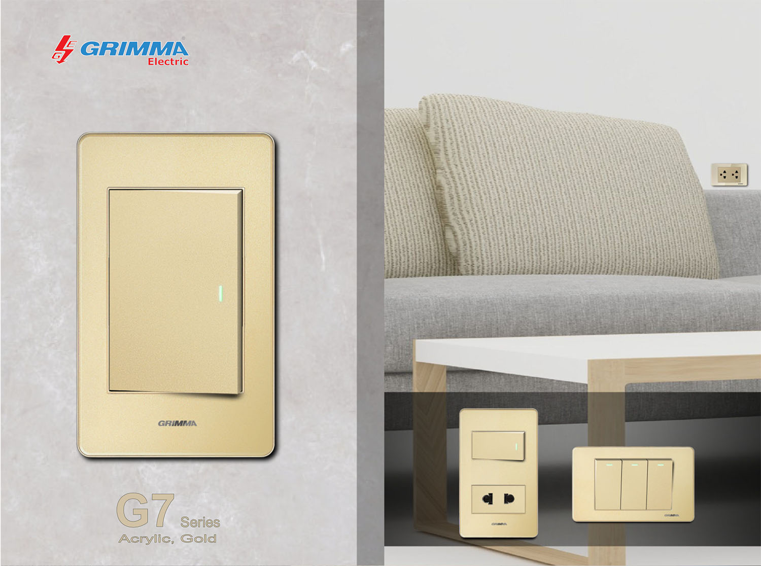 Bộ công tắc đơn 2 chiều và ổ cắm 2 chấu Grimma, mặt Acrylic vàng G7 series G7ACGK12SK2