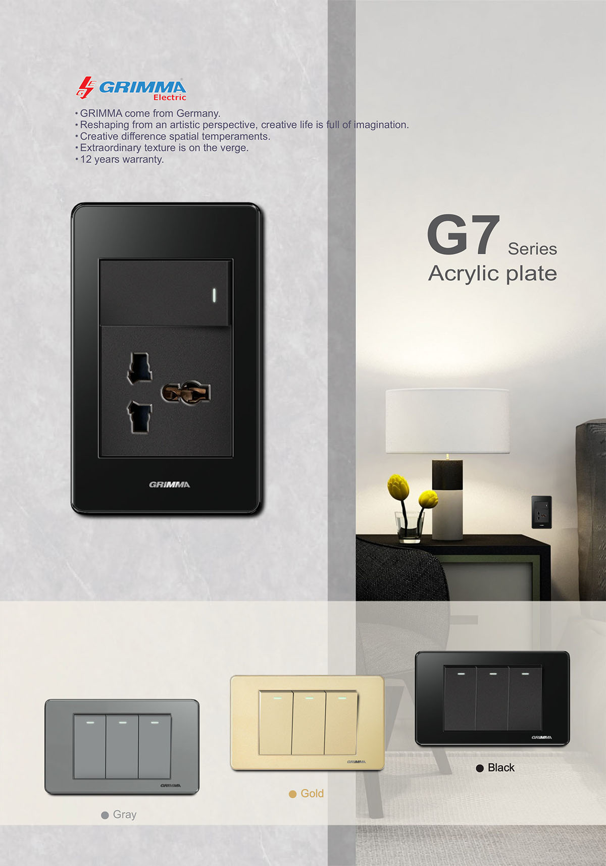 Bộ 3 công tắc 1 chiều + 3 ổ cắm 2 chấu Grimma, mặt Acrylic xám G7 series G7ACXK313SK2