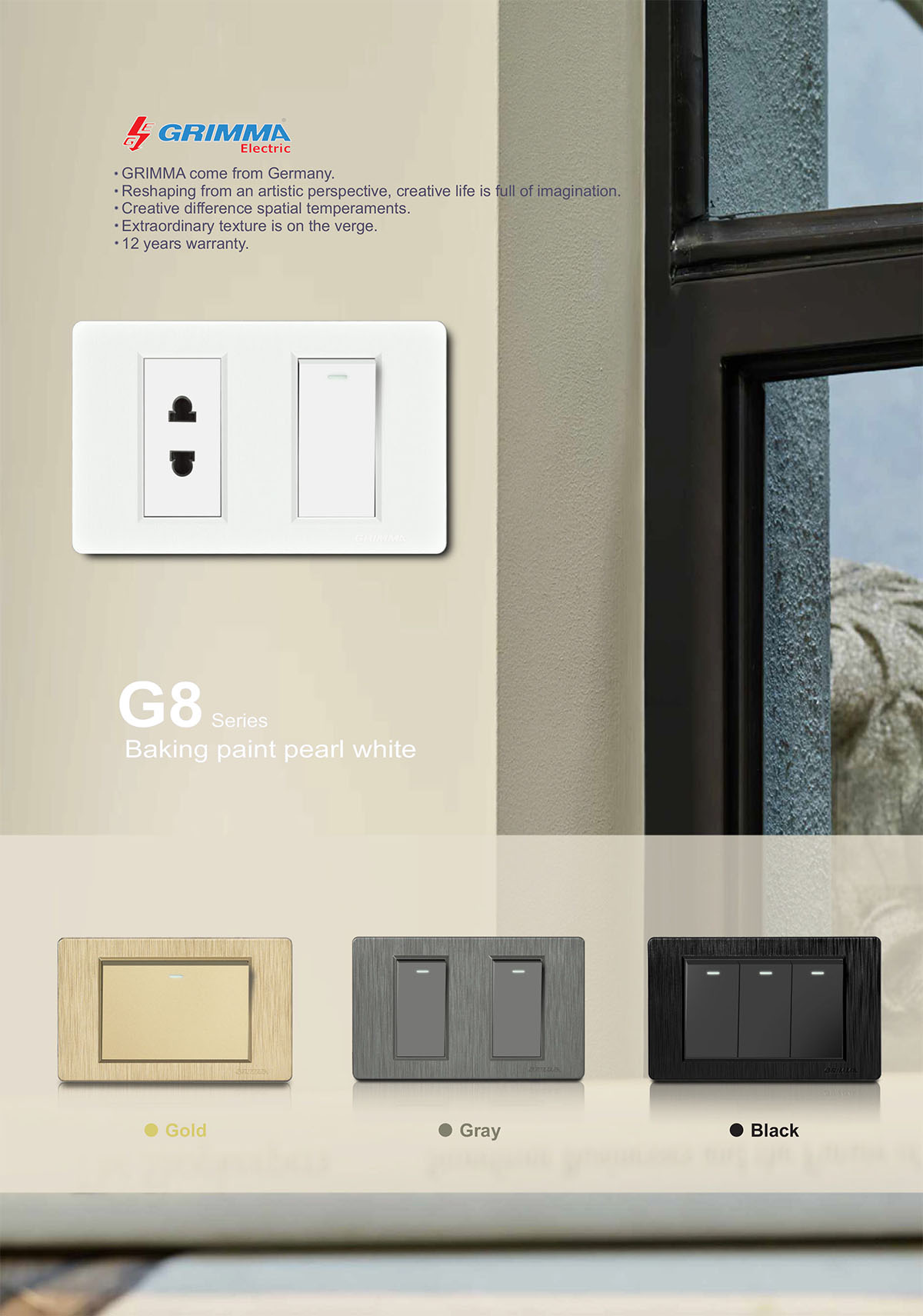 Bộ công tắc đơn 2 chiều và ổ cắm 2 chấu Grimma, mặt nhựa vân xước G8 series G8K12SK2