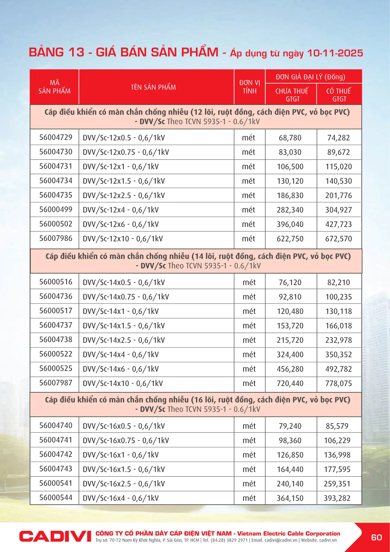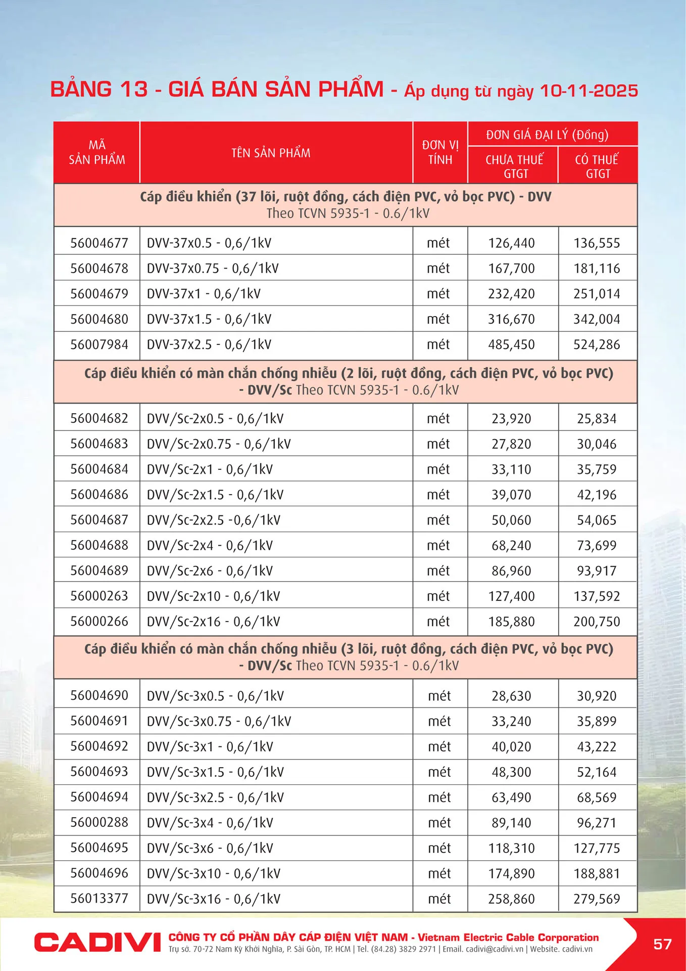 Dưới đây là bảng giá Cáp điều khiển Cadivi cập nhật 2025