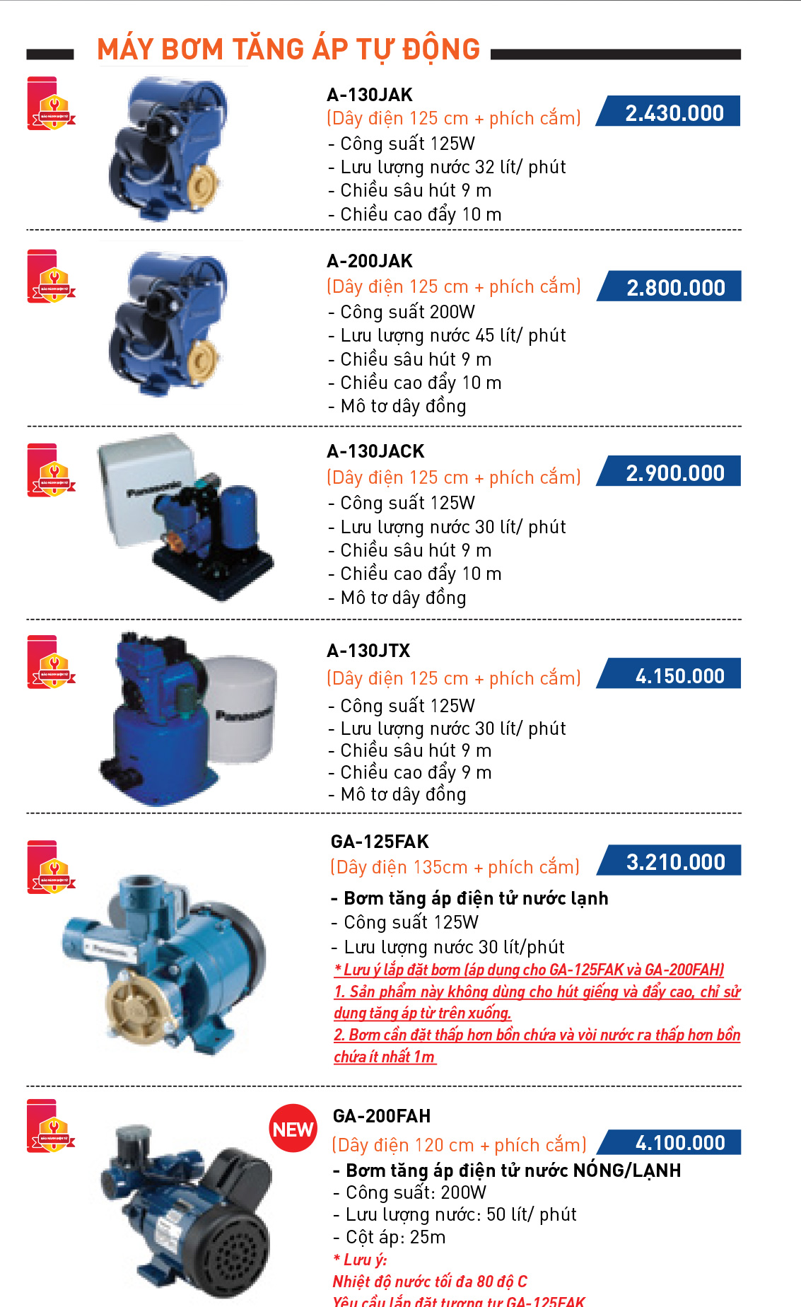 Máy bơm nước Panasonic được đánh giá là một trong những thương hiệu máy bơm nước tốt nhất và được sử dụng phổ biến hiện nay; với các ưu điểm: đa dạng, mẫu mã đẹp, gọn nhẹ, dễ sử dụng, chất lượng tốt, tiết kiệm điện đặc biệt là rất bên với thời gian.