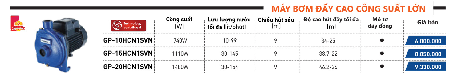 - Dòng máy bơm nước đẩy cao Panasonic có mã chữ cái đầu tiên là GP có công suất thiết kế: 125W, 200W, 250W, 350W, model mới 740W, 1100W, 1480W