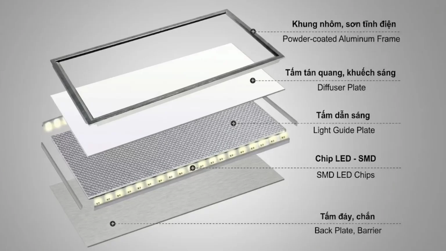 Tấm tán quang (Diffuser) thường được làm từ nhựa PC (Polycarbonate) hoặc PMMA (Acrylic) chất lượng cao. Nhiệm vụ chính của nó là bẻ gãy các tia sáng đi thẳng từ chip LED, khuếch tán chúng ra nhiều hướng khác nhau.