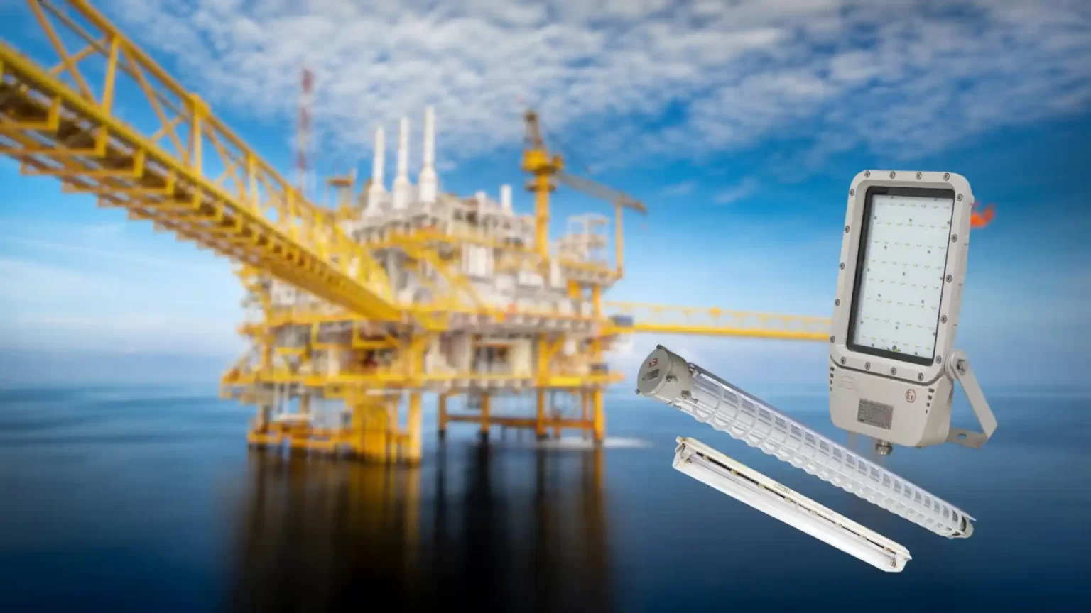 Khu vực khai thác dầu khí là một trong những môi trường nguy hiểm nhất, nơi mà các khí dễ cháy như metan và các hợp chất hóa học khác tồn tại trong không khí. Trong môi trường này, đèn chiếu sáng không chỉ cần phải đủ mạnh để chiếu sáng không gian rộng lớn mà còn phải được thiết kế sao cho không gây ra sự cố cháy nổ.