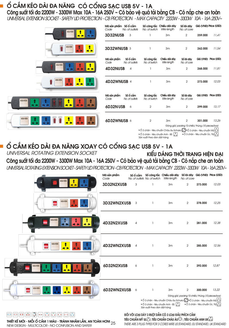 Công suất tối đa 2200W - 3300W Max 10A - 16A 250V ~ có bảo vệ bằng CB - có nắp che an toàn.