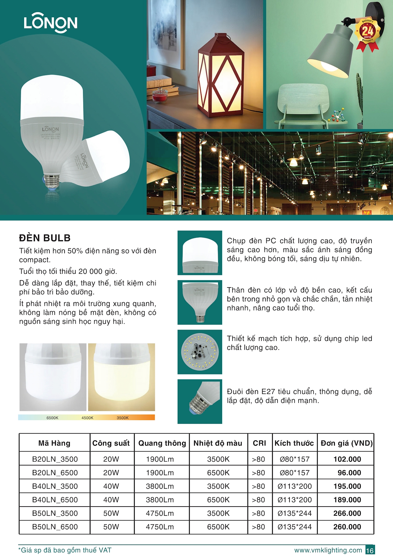 50W - Ánh sáng vàng (3500K) | B50LN_3500 | 266.000 | 30% | 186.200 |