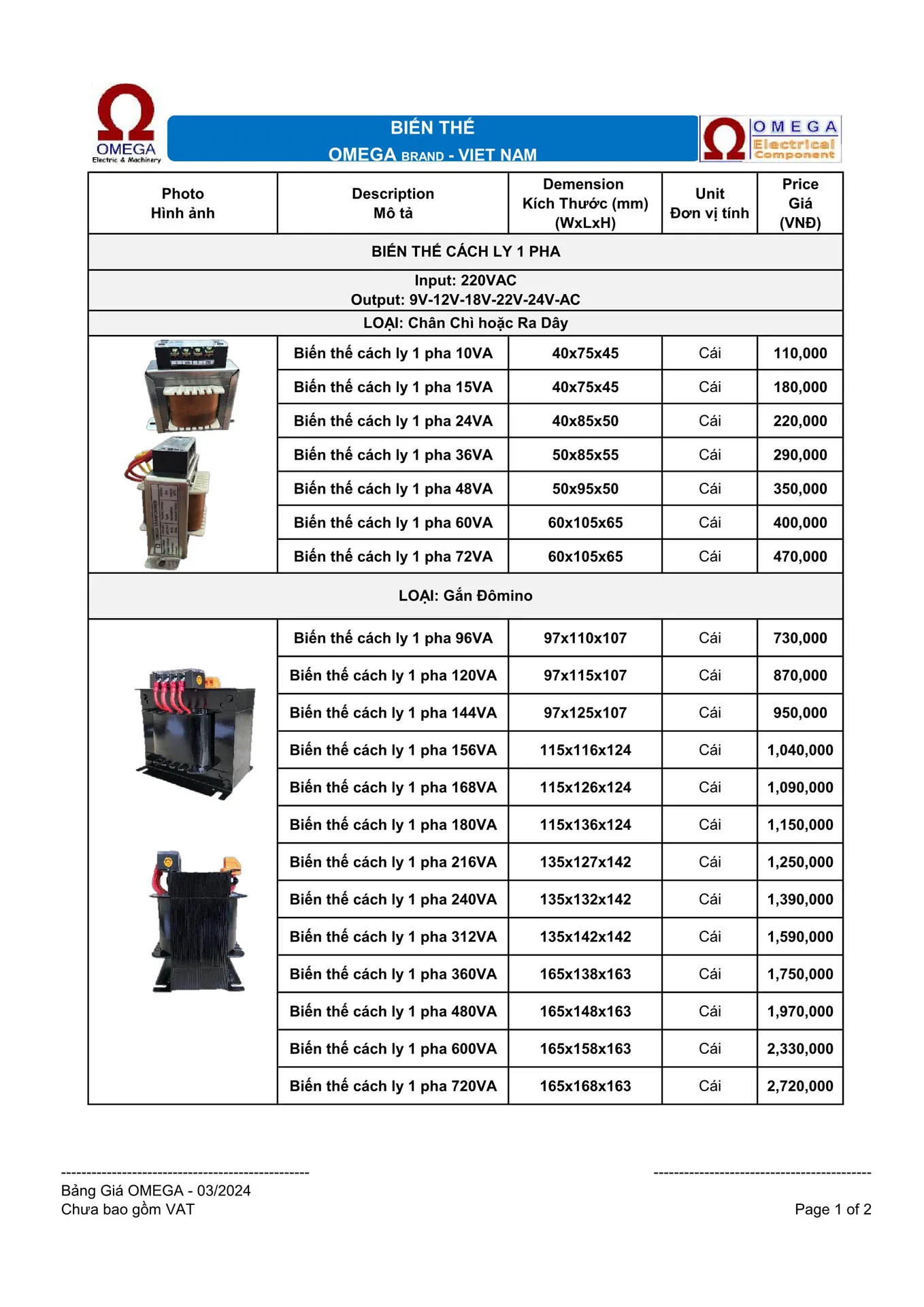 Biến thế cách ly 1 pha - Biến thế cách ly Omega 1 pha (Gắn Đômino)