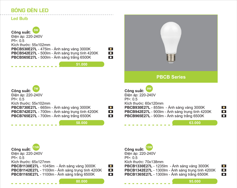 5W - 6500K | PBCB565E27L | 55x102mm | 500 lm | 65.000 | 30% | 45.500 |