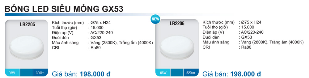 | 1 |  | Ánh sáng trắng ấm | LR2205/GX53/CW | 350.000 | 40% | 210.000 |