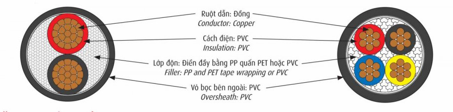 Cáp CVV dùng cho hệ thống truyền tải và phân phối điện, cấp điện áp 0,6/1 kV, lắp đặt cố định.