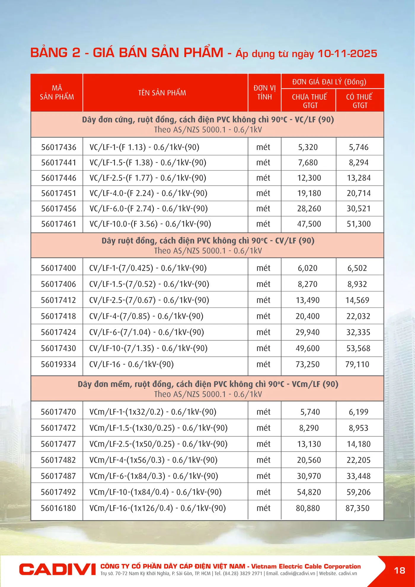 56017400 - Dây ruột đồng Cadivi CV/LF (90) cách điện PVC không chì 90ºC 0.6/1kV