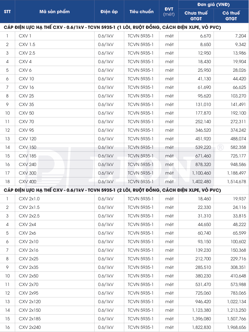 CXV - 2x1.5 | CXV - 2x1.5(2x7/0.52) | 24.116 | 14% | 20.740 |