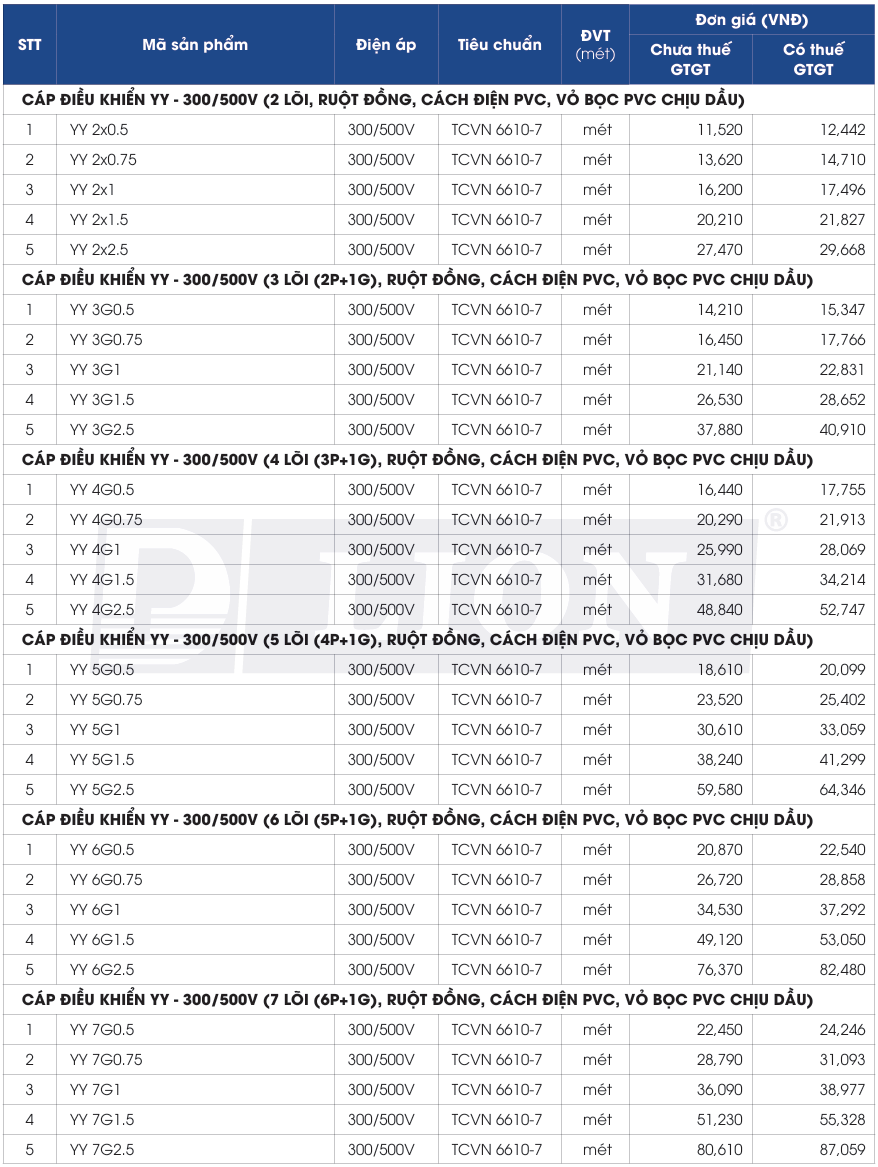 Cáp điều khiển YY 4x2.5 | YY 4G2.5 | 52.747 | 22% | 41.143 |