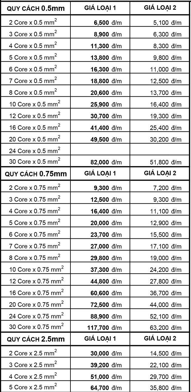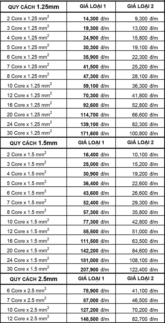 20 Core (loại 1) | 20 Core x 1.5 mm2 | 139.600 | 15% | 118.660 |