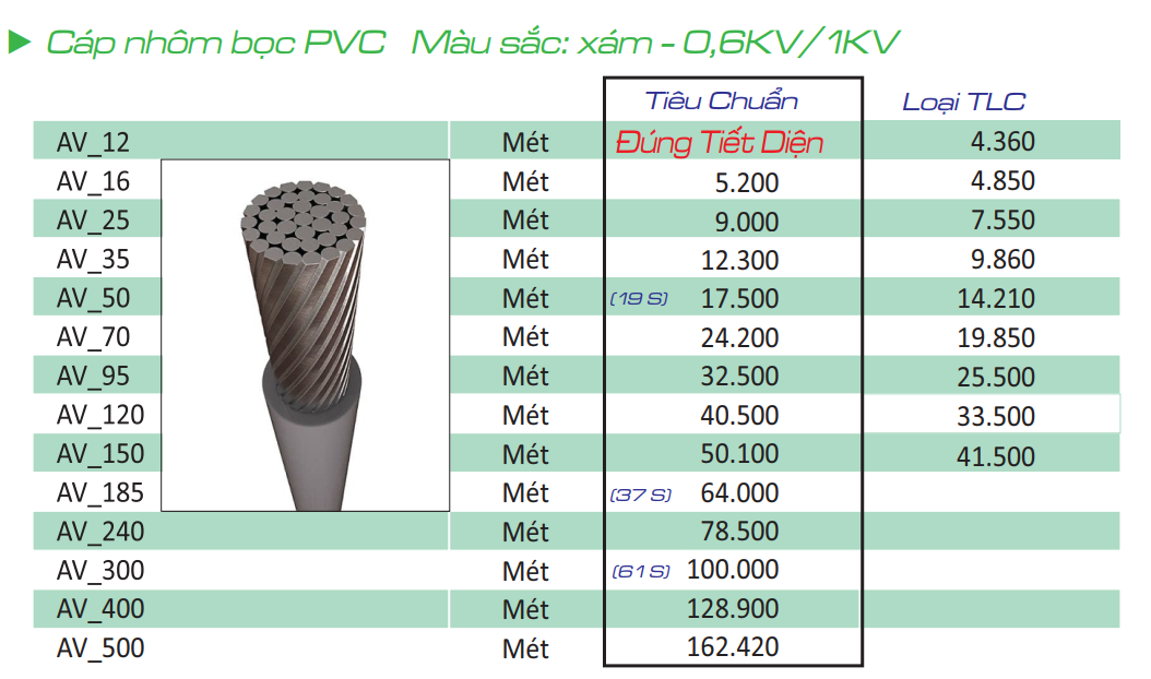 AV_12 - Cáp nhôm bọc PVC 0.6/1KV (Loại TLC- thiếu ly)