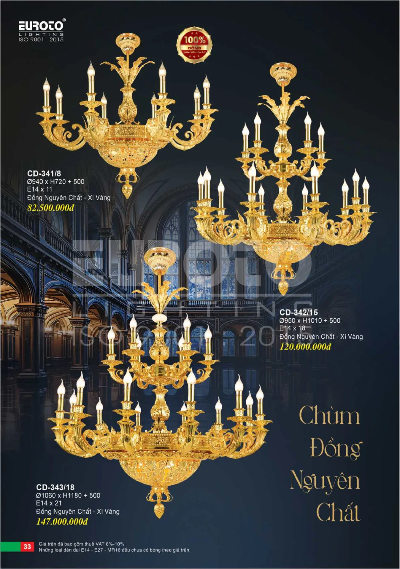 Đèn chùm nến đồng Ø940*H720+500 - E14*11 đồng nguyên chất - xi vàng