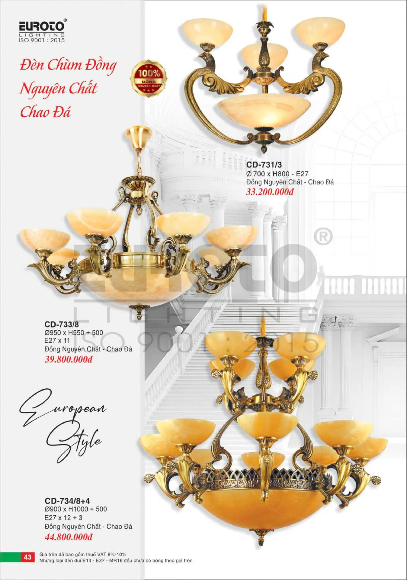 Đèn chùm đồng Ø950*H550+500 - E27*11 đồng nguyên chất - chao đá