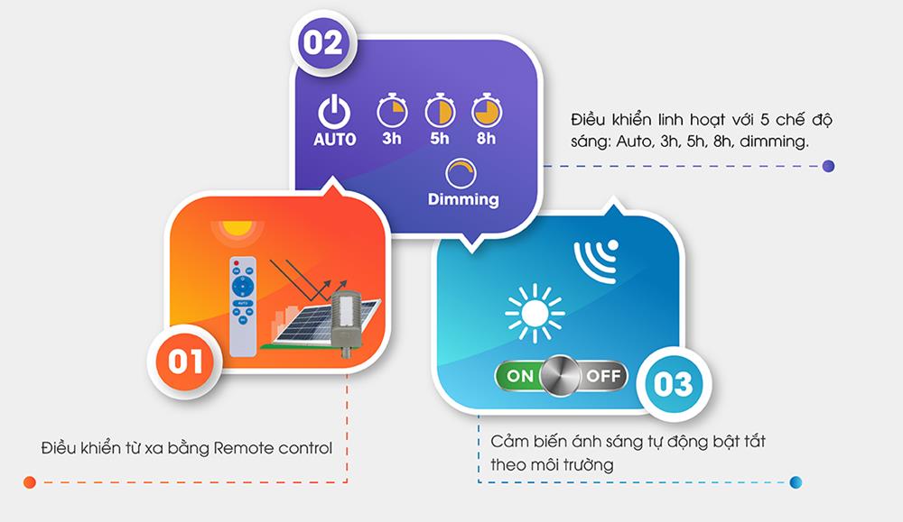 - Điều khiển 5 chiế độ sáng: Auto, 3h,5h,8h, dimming