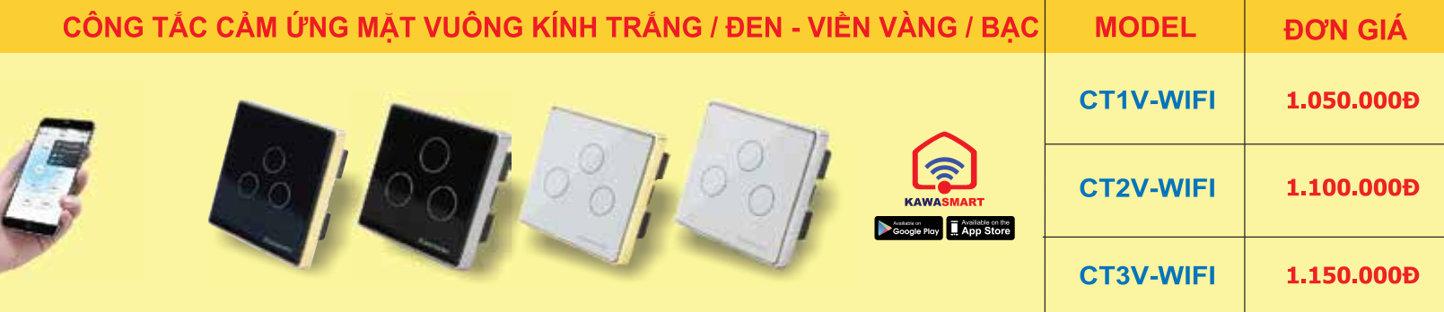 Công tắc ba Kawasan vuông cảm ứng chạm wifi màu trắng