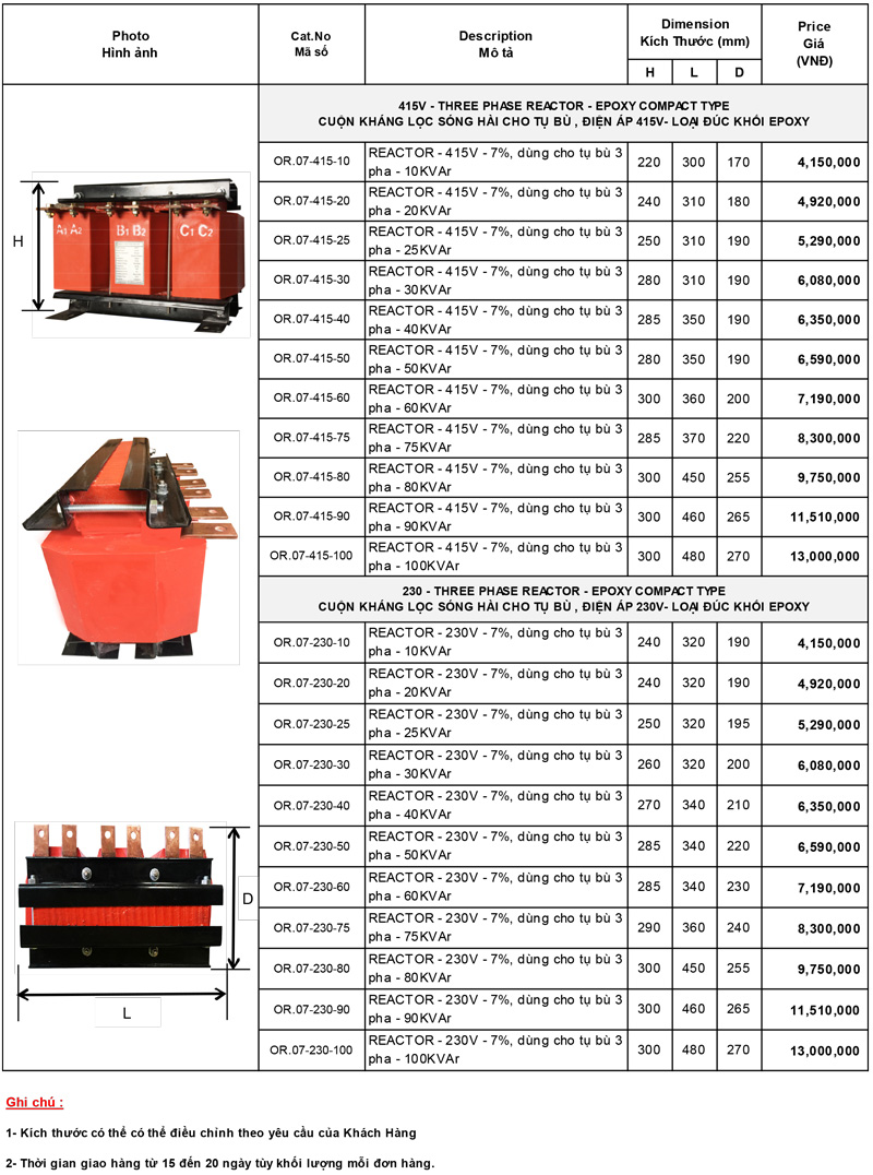 OR.07-415-50 - Cuộn kháng lọc sóng hài cho tụ bù, điện áp 415V - 7%, loại đúc khối EPOXY