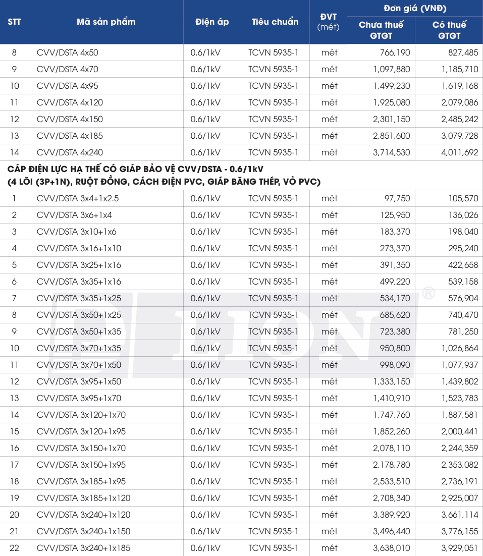 CVV/DSTA-3x10+1x6(3x7/1.35+1x7/1.04) | CVV/DSTA-3x10+1x6(3x7/1.35+1x7/1.04) | 198.040 | 14% | 170.315 |