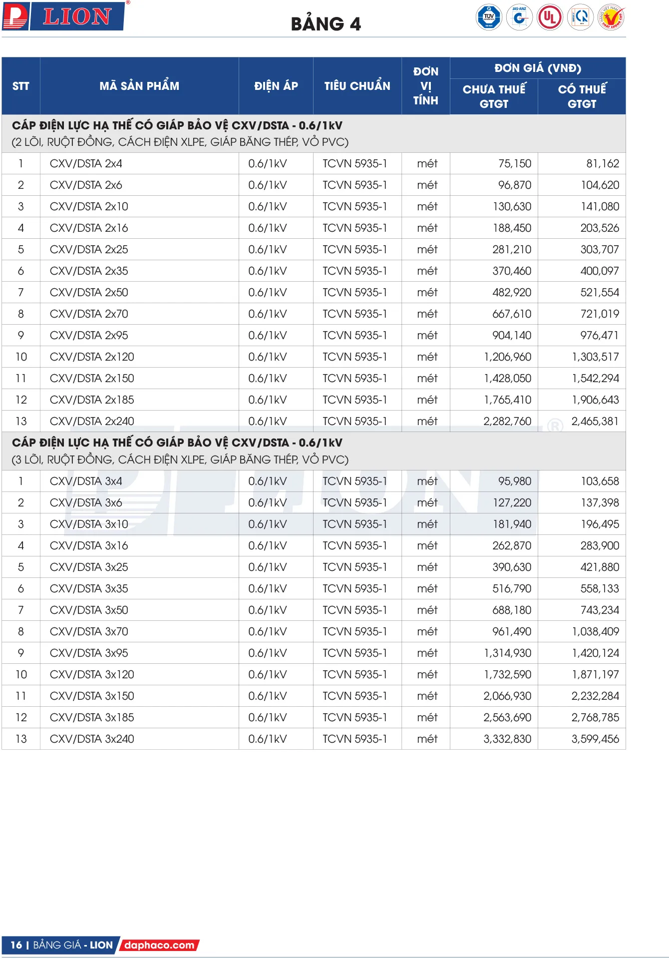 LION CXV/DSTA 2x120 | CXV/DSTA 2x120 | 1.303.517 | 5% | 1.238.342 |