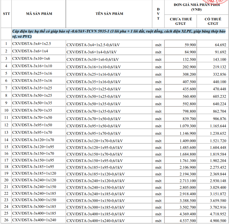 Bảng Giá Cáp điện lực hạ thế có giáp bảo vệ -0.6/1kV-TCVN 5935-1 (3 lõi pha + 1 lõi đất, ruột đồng, cách điện XLPE, giáp băng thép bảo