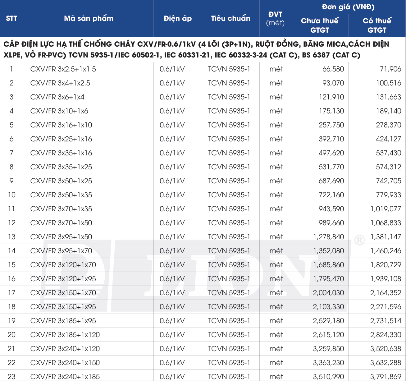 CXV/FRT-3x70+1x50 | CXV/FRT-3x70+1x50 | 1.068.833 | 22% | 833.690 |