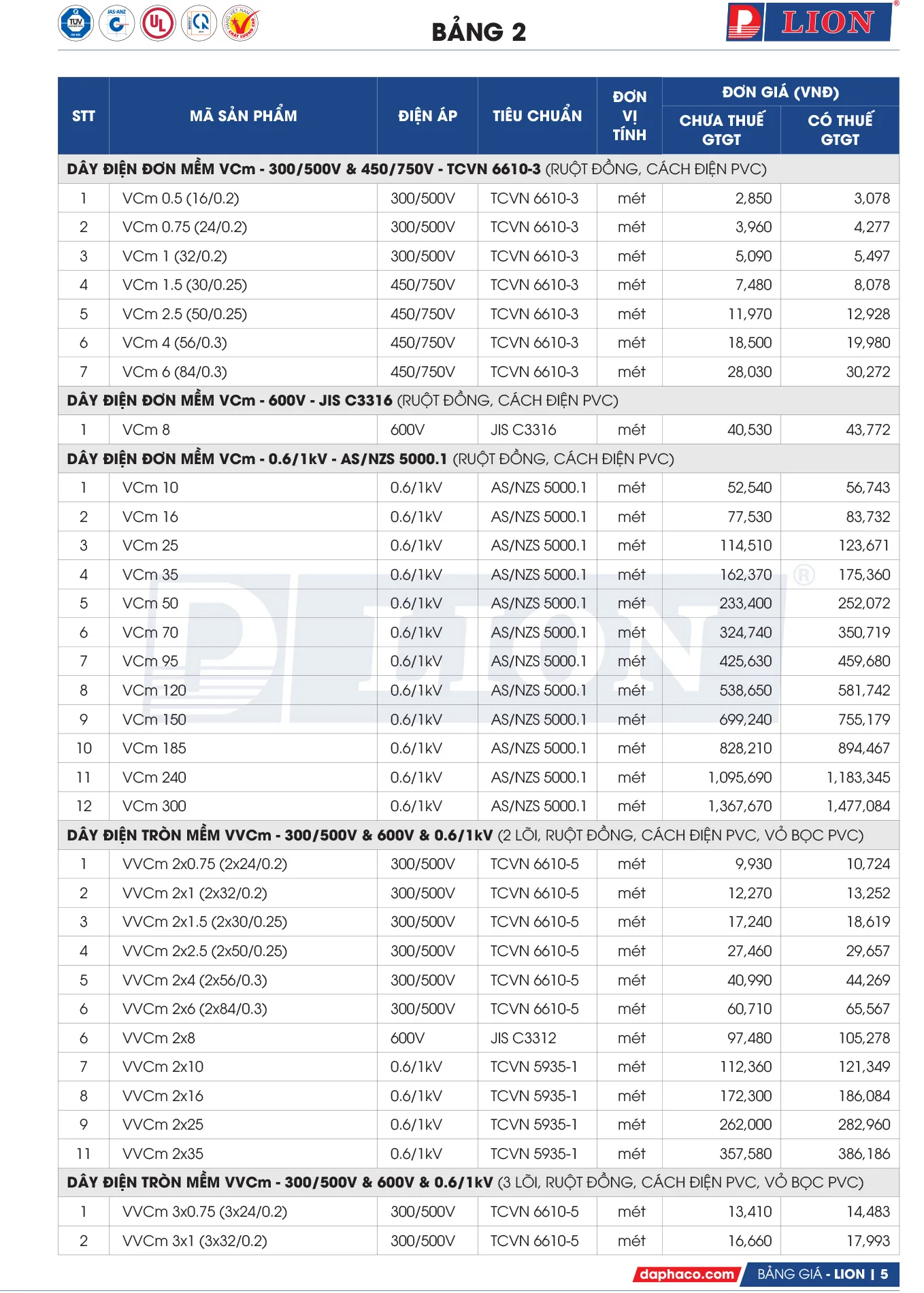 Dây điện đơn mềm VCm - 0.6/1kV - AS/NZS 5000.1 LION