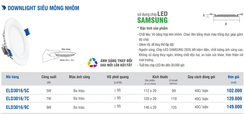 Đèn Downlight LED nhôm siêu mỏng 3 màu Roman ELD3016