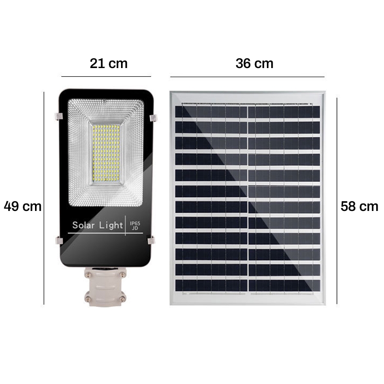 Bộ sản phẩm gồm: Đèn + điều khiển từ xa thông minh + tấm pin năng lượng mặt trời + cần gắn đèn