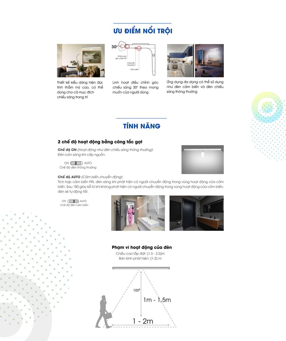 - Đèn tự động tắt sau 180s kể từ khi phát hiện không có người chuyển động trong phạm vi hoạt động của cảm biến
