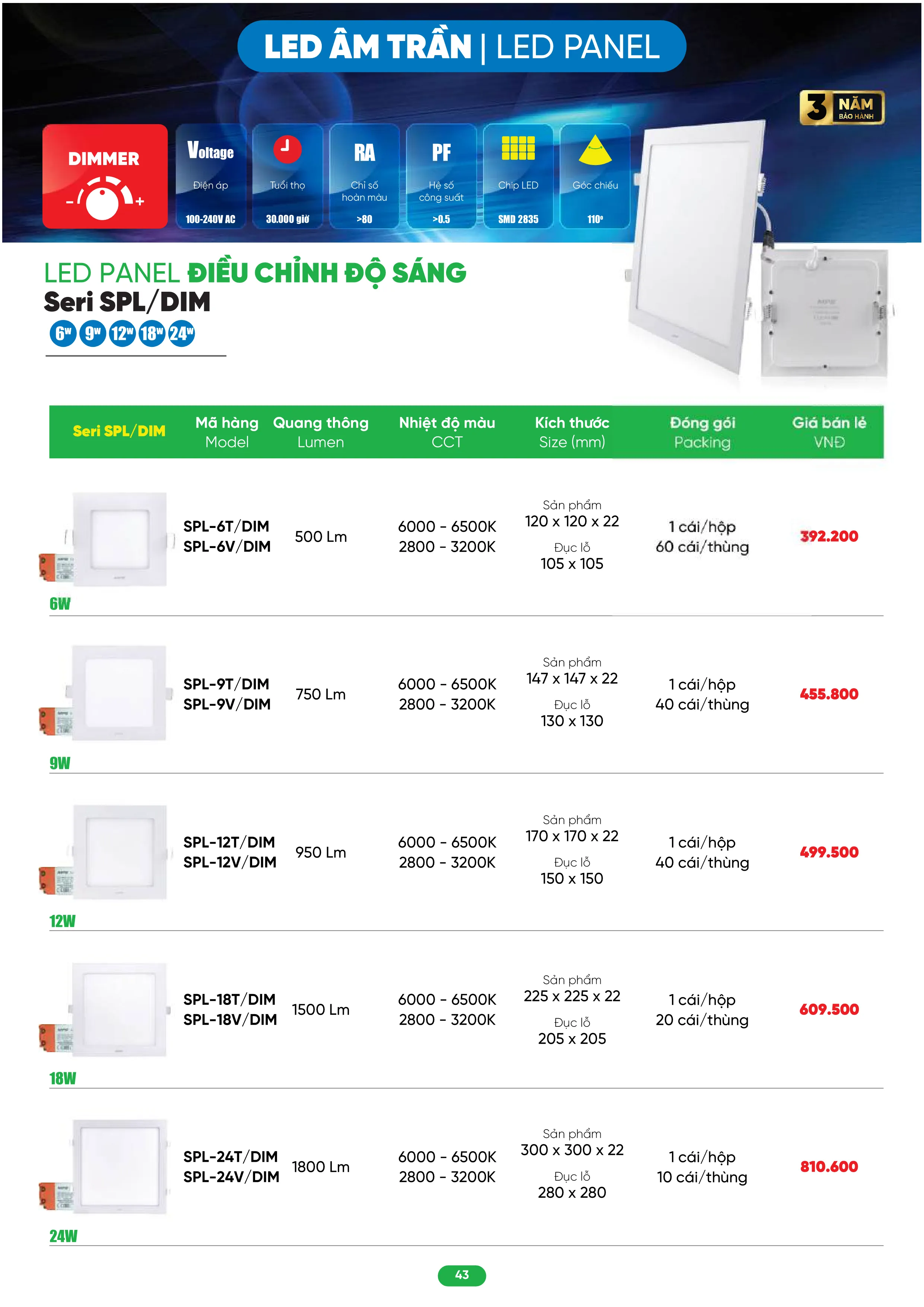 | SPL-6V/DIM | 6W | 500 lm | 120 x 120 x 25 mm | Ø105 x 105 mm | 1/hộp - 60/thùng |