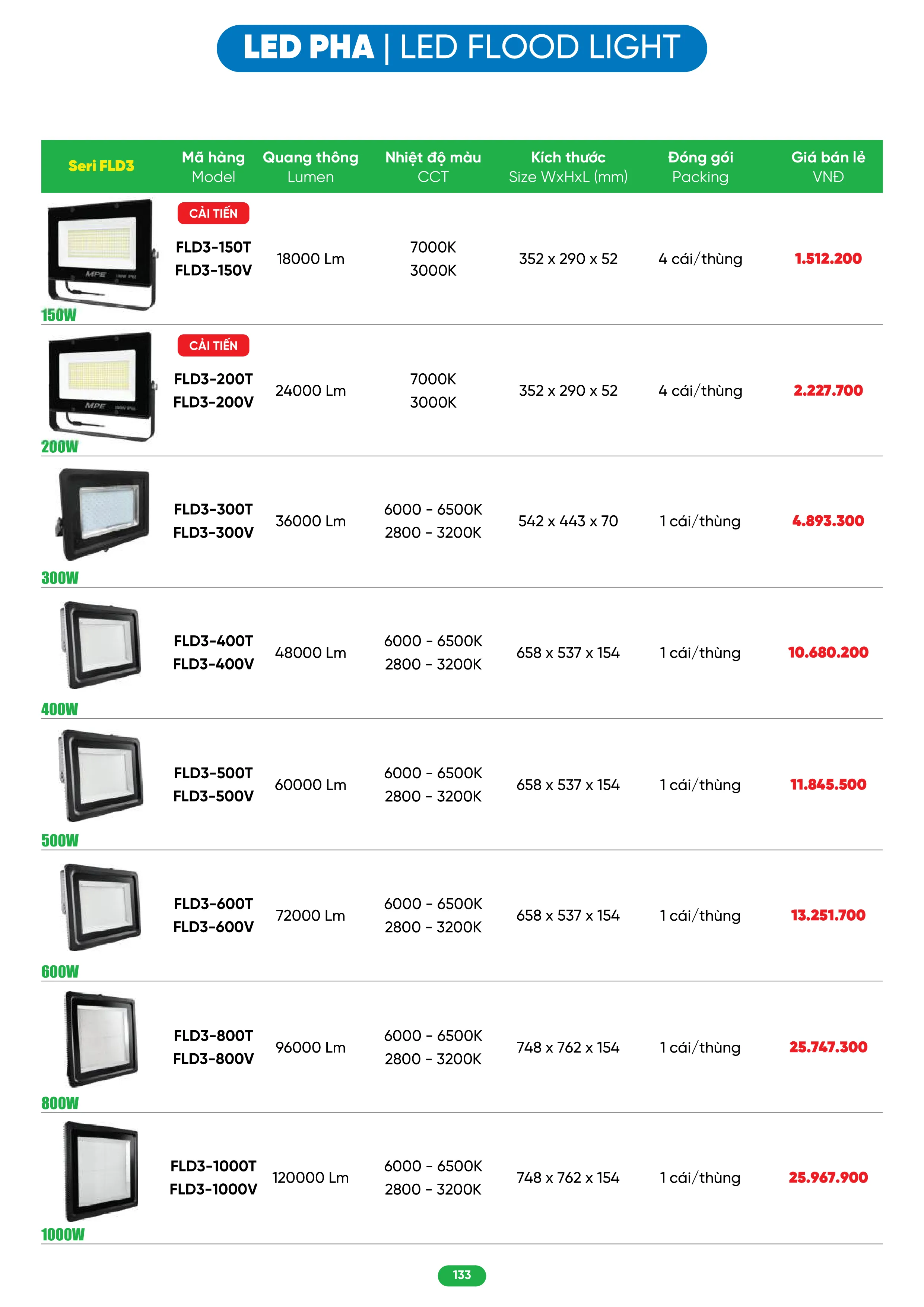 - Nhiệt độ màu (CCT): 6000-6500K/2800-3200K. Đèn LED Pha FLD3 150W có 2 loại ánh sáng trắng, vàng tương ứng với các mã FLD3-150T, FLD3-150V