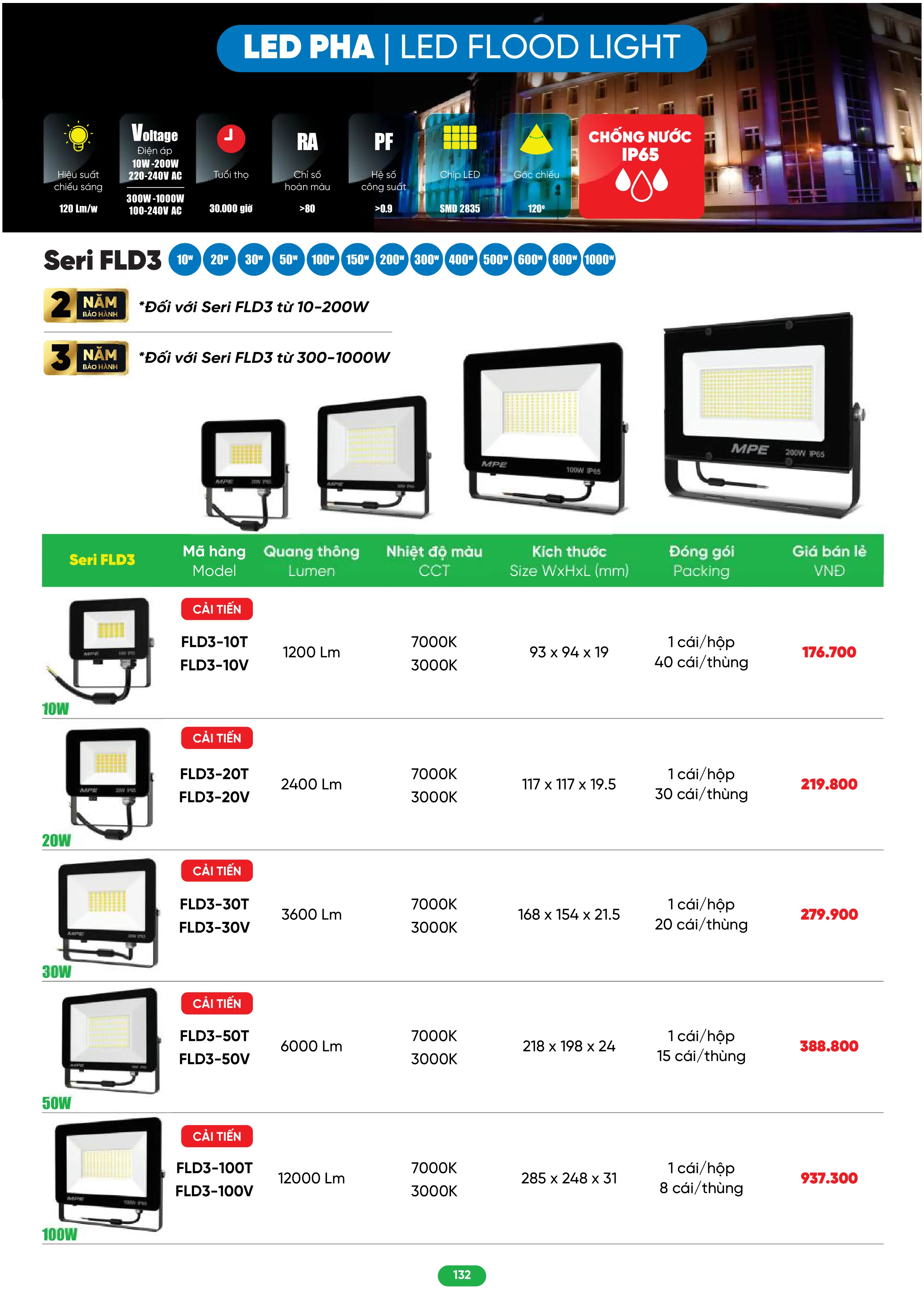- Nhiệt độ màu (CCT): 6000-6500K/2800-3200K. Đèn LED Pha FLD3 20W có 2 loại ánh sáng trắng, vàng tương ứng với các mã FLD3-20T, FLD3-20V