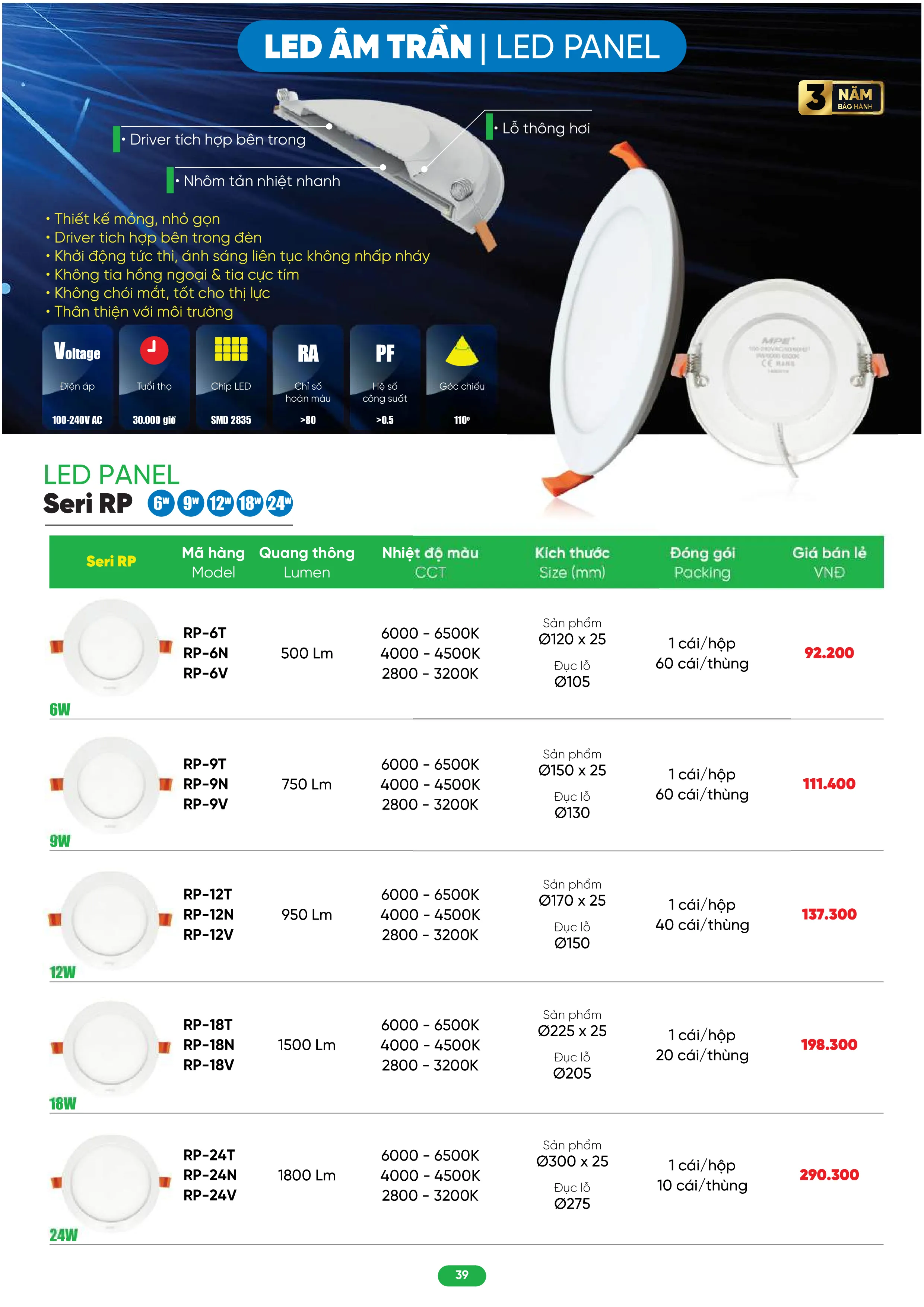 | RP-9T | 9W | 750 lm | Ø150 x 25 mm | Ø 130 mm | 1/hộp - 40/thùng |