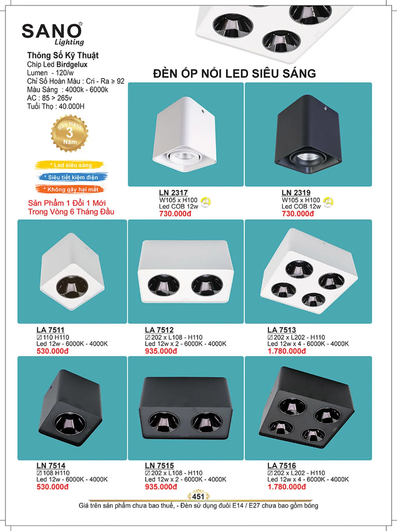 Đèn ốp nổi vuông Sano LN 7515 Ø202*L108*H110 12W x 2