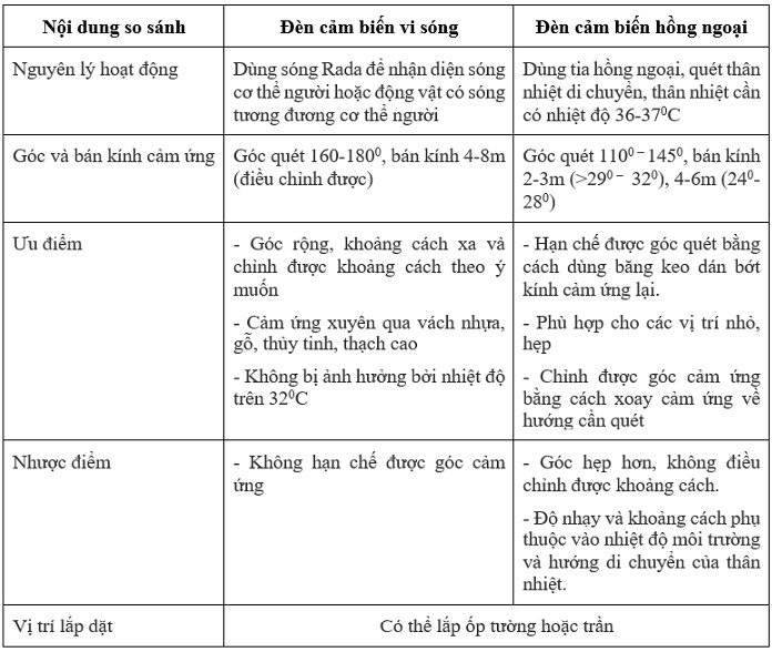 SO SÁNH SỰ KHÁC BIỆT ĐÈN CẢM BIẾN HỒNG NGOẠI VÀ ĐÈN CẢM BIẾN VI SÓNG