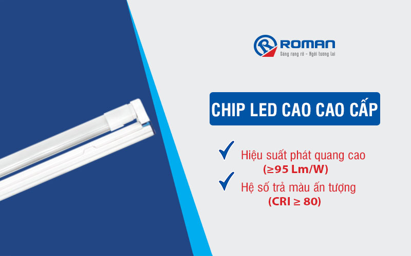 Đèn tuýp LED Roman sử dụng chip OSRAM 2835 cho hiệu suất phát quang cao ≥ 95 Lm/W nên đèn có chất lượng ánh sáng tốt, cho ra hệ số trả màu ấn tượng (CRI ≥ 80) đáp ứng tiêu chuẩn chiếu sáng Việt Nam TCVN 7114:2008.
