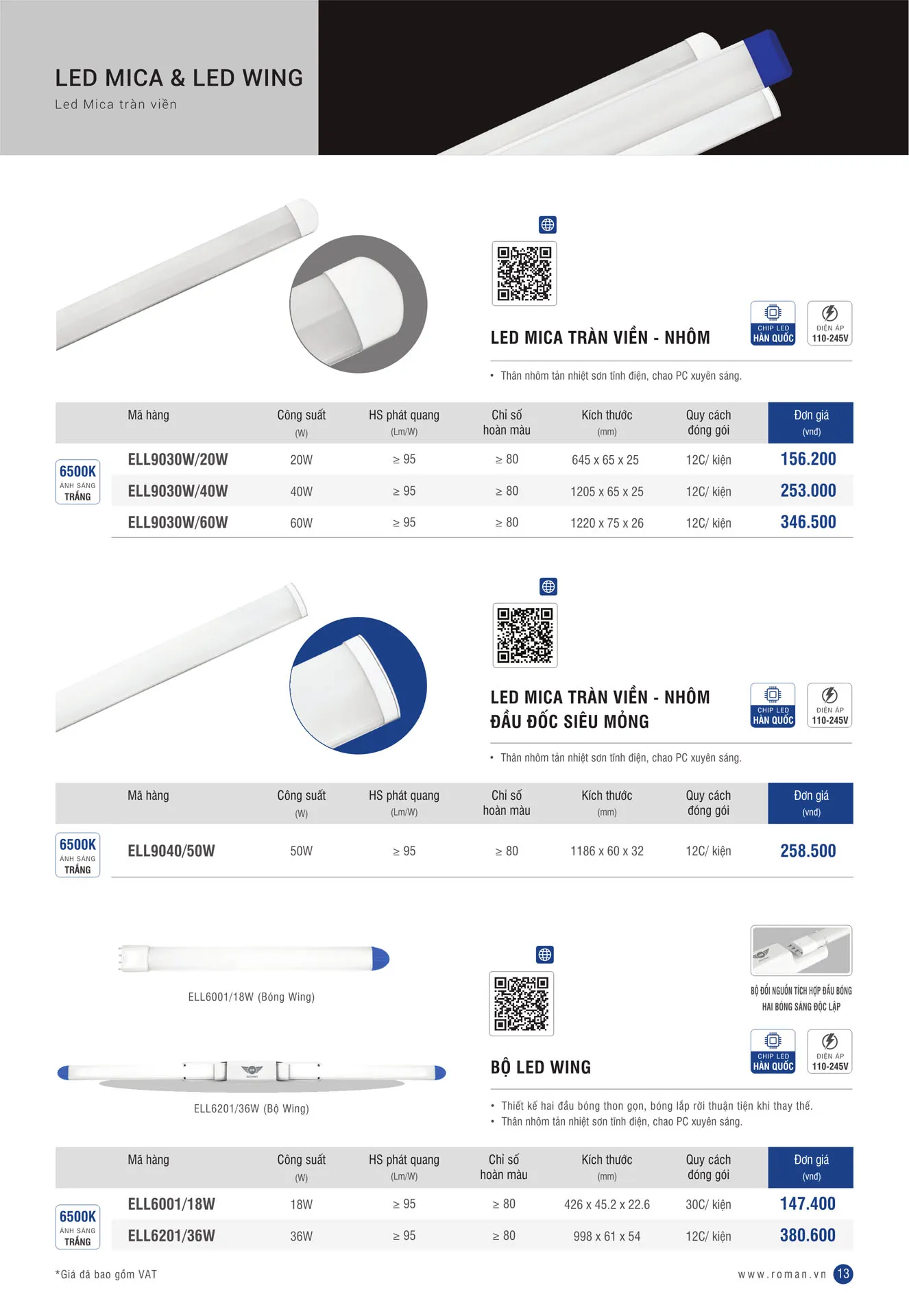 - Nguồn sáng của đèn sử dụng chip LED Hàn Quốc chất lượng cao với hiệu suất phát quang ≥ 95 Lm/W, độ bền cao. Đèn LED Mica ELL9040 có màu ánh sáng trắng (6500K) với độ sắc nét và tính trung thực cao, an toàn cho mắt.