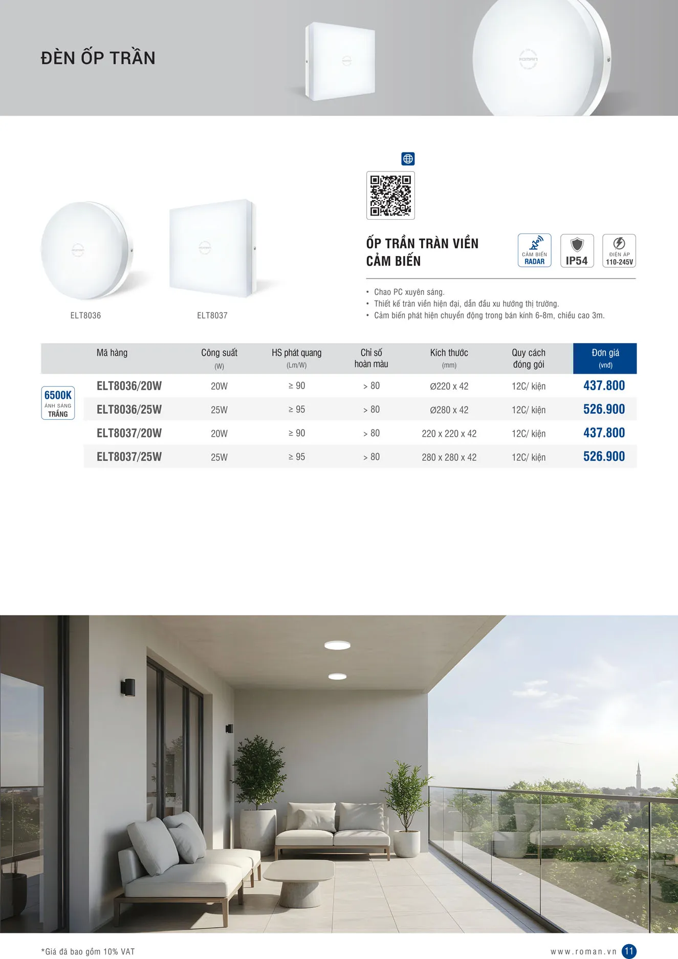 Đèn ốp trần tròn tràn viền Roman ELT8036 có cảm biến