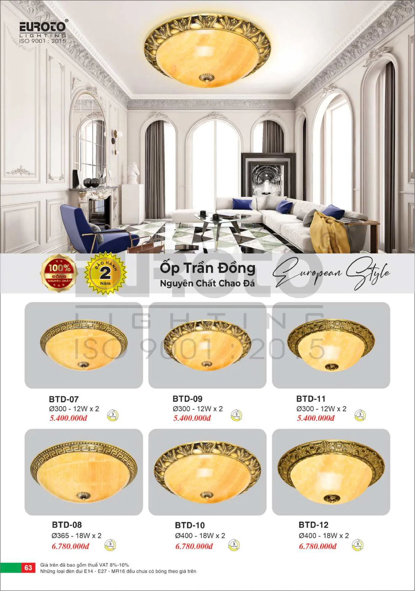 Đèn ốp trần đồng nguyên chất Ø370, LED 18W*2 - Ánh Sáng Vàng