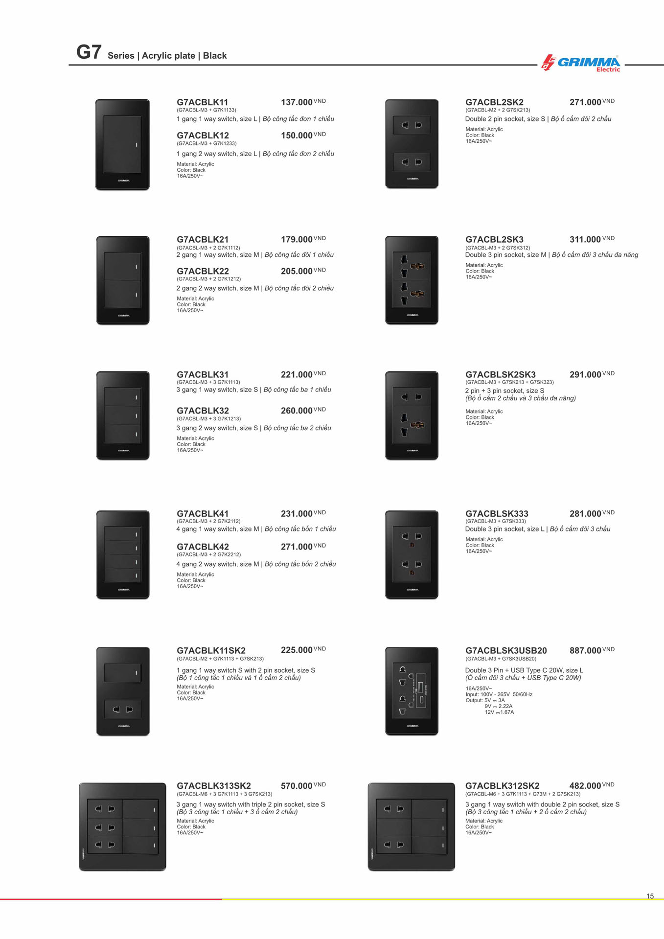 Bộ ổ cắm đôi 3 chấu + USB Type C Grimma G7ACBLSK3USB20
