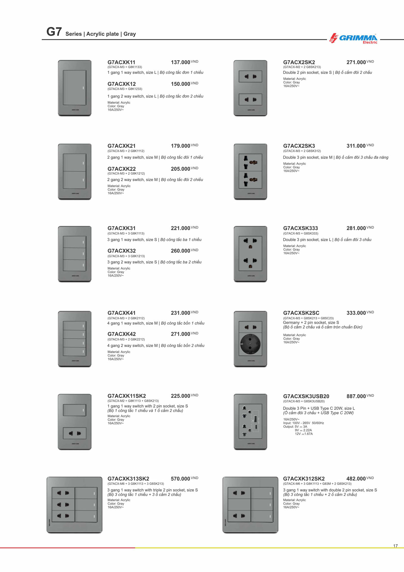 Bộ ổ cắm đôi 3 chấu + USB Type C Grimma G7ACXSK3USB20