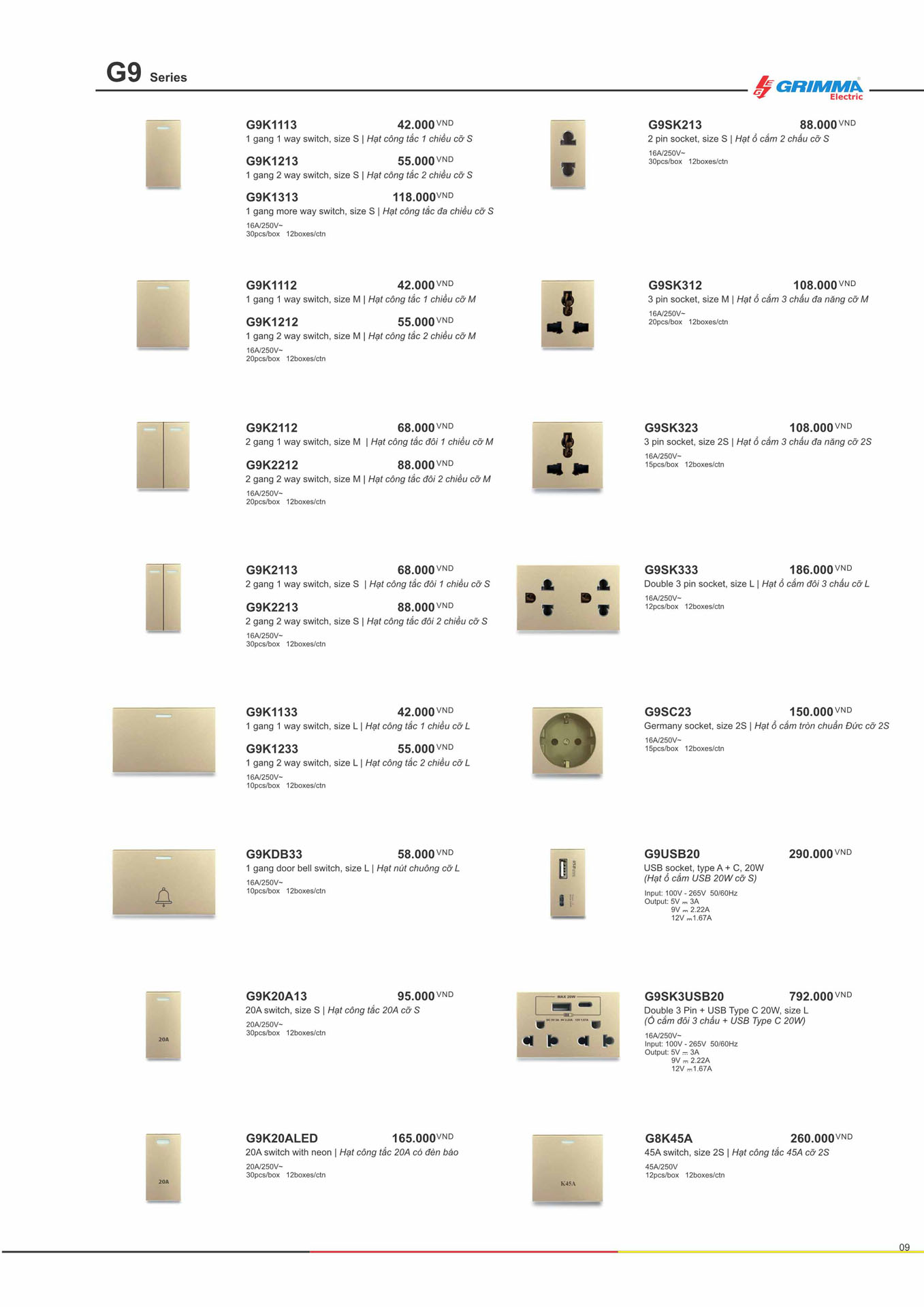 Hạt công tắc 45A cỡ 2S Grimma G9 series, G9K45A