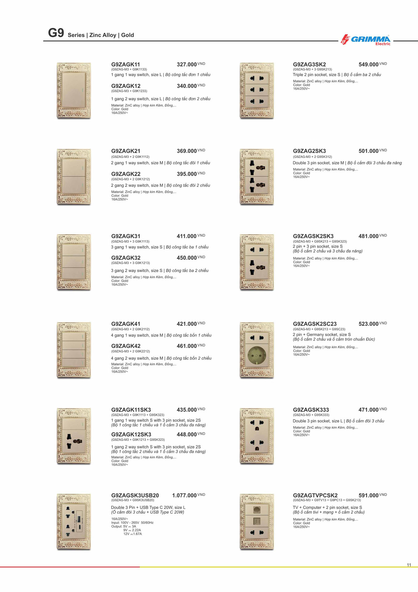 Bộ ổ cắm đôi 3 chấu + USB Type C GRIMMA G9ZAGSK3USB20