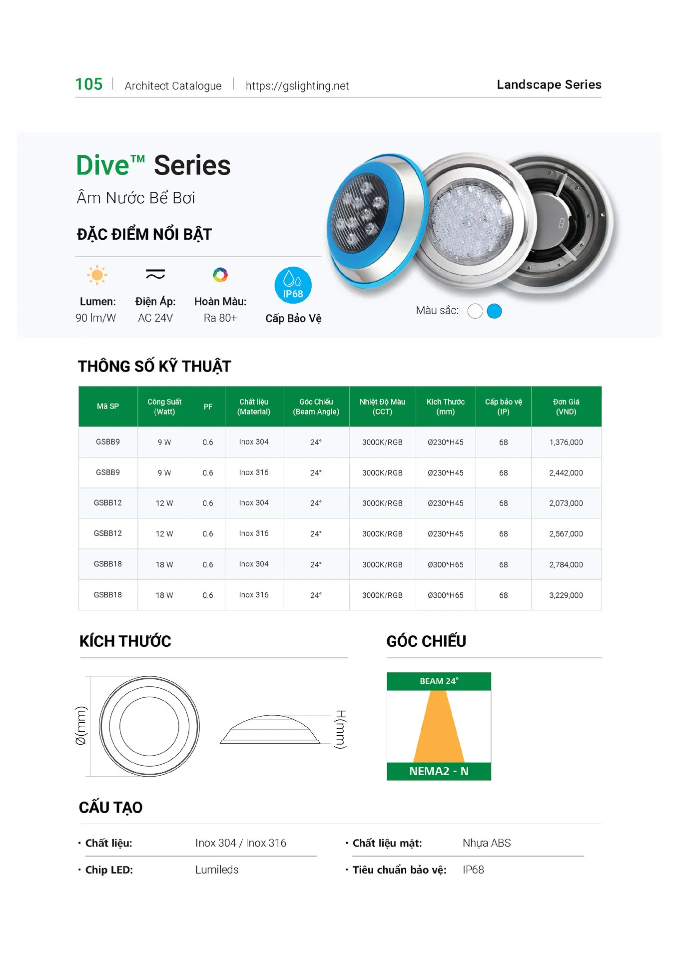 Đèn Led âm nước bể bơi GS Lighting GSBB Inox 304