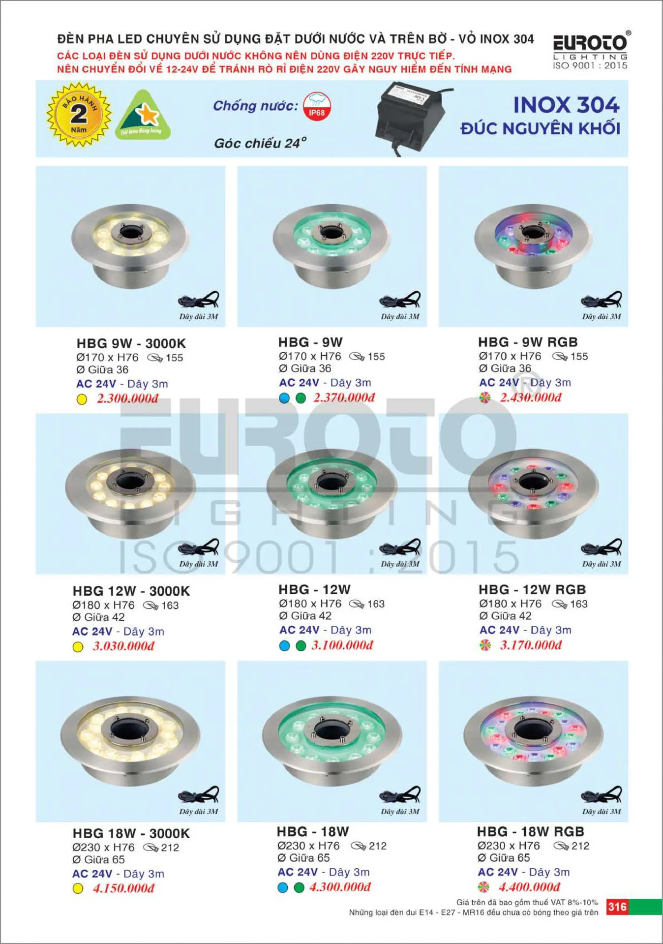 - Chuyên sử dụng đặt dưới nước và trên bờ - vỏ INOX - Đèn bắt buộc phải sử dụng qua Ballats 24V |